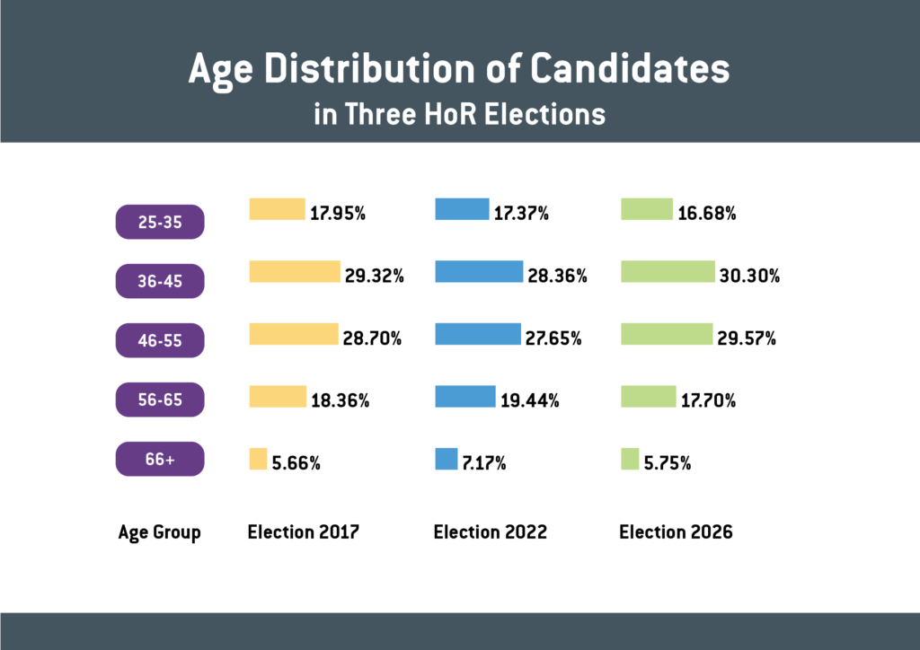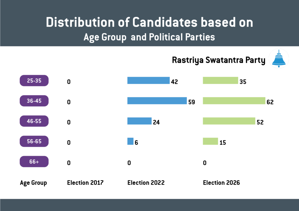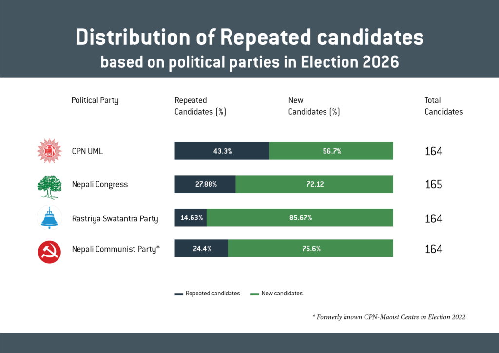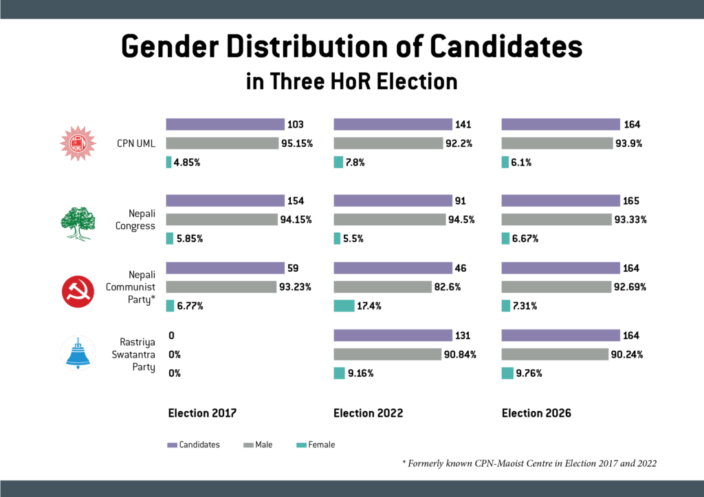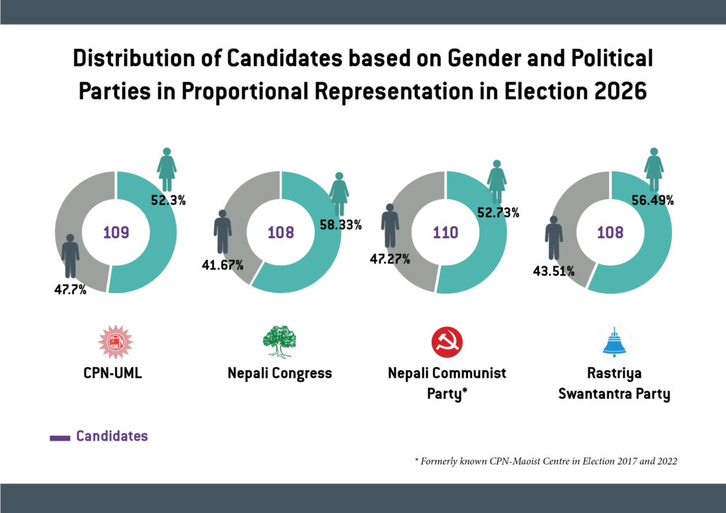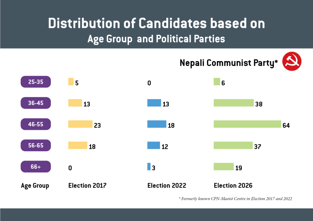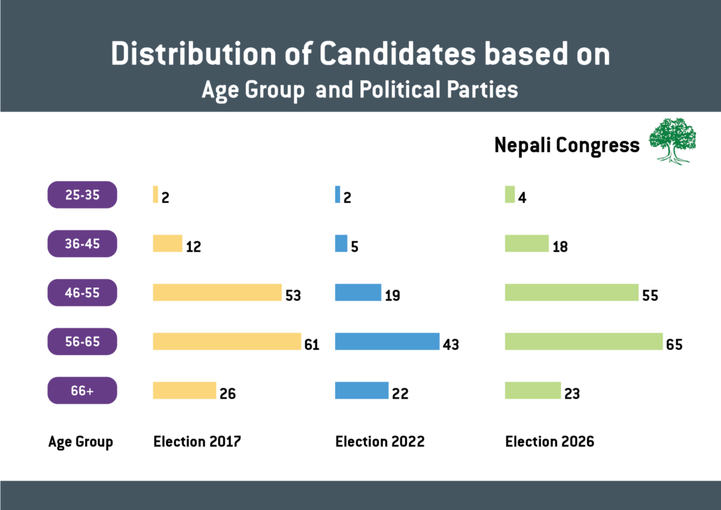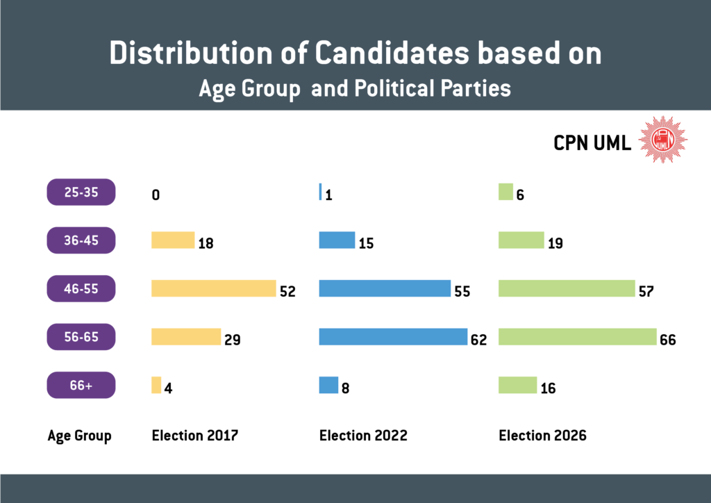Debates on the candidates’ profiles have dominated both mainstream and social media in the run up to the elections in Nepal. The upcoming election, announced on the heels of the September 2025 Gen Z protests, is different not just because the sitting parliament was yet to complete its five-year term but also because the narrative of old vs new has gripped the entire country. Youth and thereby representation by age group has become a major talking point and this has meant that the age group of the candidates have attracted major eyeballs. Furthermore, the narrative of the same old faces vs fresh ones has also dominated public conversations. Similarly, representation based on gender has been a major concern; the percentage of female first past the post candidates from political parties have barely hit double digits, with parties relying heavily on the proportional candidates list to reach the mandated 33 percent female representation in the parliament. In this context, we have presented a series of infographics with a comparative perspective on the candidates from the major four political parties in the 2017, 2022 and the upcoming 2026 elections.