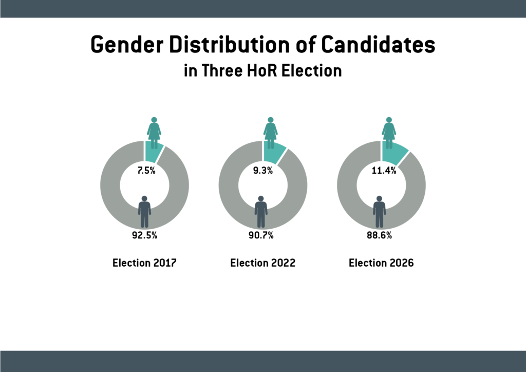 Candidacy in the 25-35 age group category has remained consistently low except for the Rastriya Swatantra Party, (42 in 2022 and 35 in 2026 elections) This may be explained by their relatively recent entry in the national political arena. While the major bulk of candidates for Nepali Communist Party and the RSP fall within the 36-45 and 46-55 brackets, for the CPN-UML and the Nepali Congress, the majority of candidates have been from the 46-55 and 56-65 age category. Interestingly, overall, in the last two and the upcoming 2026 elections, over 50 percent of the candidates have been from the 36-55 age brackets. In terms of repeated candidates, the numbers have gone down significantly for the Nepali Congress and the Nepali Communist Party in the 2026 elections, while the CPN-UML has been quite consistent with 43 percent repeated candidates in the 2022 and the 2026 elections. With regards to gender, the gains in the number of female candidates contesting first-past-the -post seats have been painfully slow. In the 2026 elections, the percentage has finally reached double digits which at just 11 percent still leaves a lot of room for improvement.